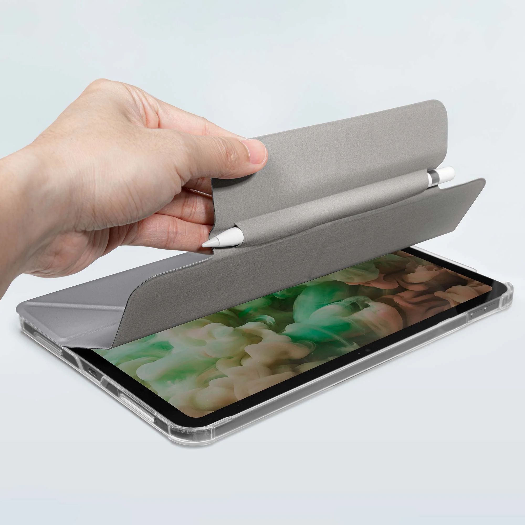 Unser einzigartiges Falt-Cover revolutioniert die Art und Weise, wie Sie mit Ihrem iPad arbeiten und bietet vielseitige Blickwinkel für jede erdenkliche Situation.