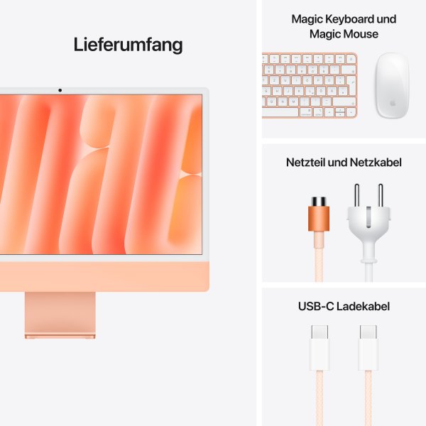iMac 24" Retina 4.5k Display M4, Orange, M4 (10-CPU/10-GPU), 16GB, 256GB, Standardglas, Touch ID, Deutsch, Gigabit Ethernet, Magic Maus, Z1EV_CTO_0