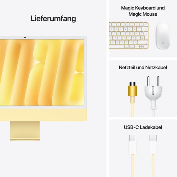 iMac 24" Retina 4.5k Display M4, Gelb, M4 (10-CPU/10-GPU), 16GB, 512GB, Standardglas, Touch ID, Deutsch, Gigabit Ethernet, Magic Maus, Z1EL_CTO_0