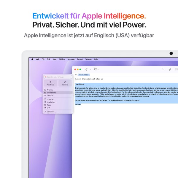Apple Intelligence, das integrierte KI-System, hilft dir bei alltäglichen Aufgaben: ob Texte zusammenfassen, Dokumente umschreiben oder kreative Projekte erstellen. Dank der on-device-Verarbeitung bleiben deine Daten privat und sicher.