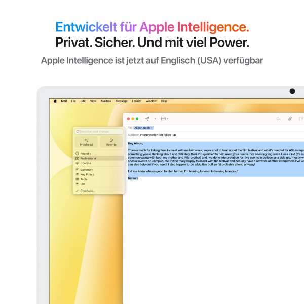 Apple Intelligence, das integrierte KI-System, hilft dir bei alltäglichen Aufgaben: ob Texte zusammenfassen, Dokumente umschreiben oder kreative Projekte erstellen. Dank der on-device-Verarbeitung bleiben deine Daten privat und sicher.