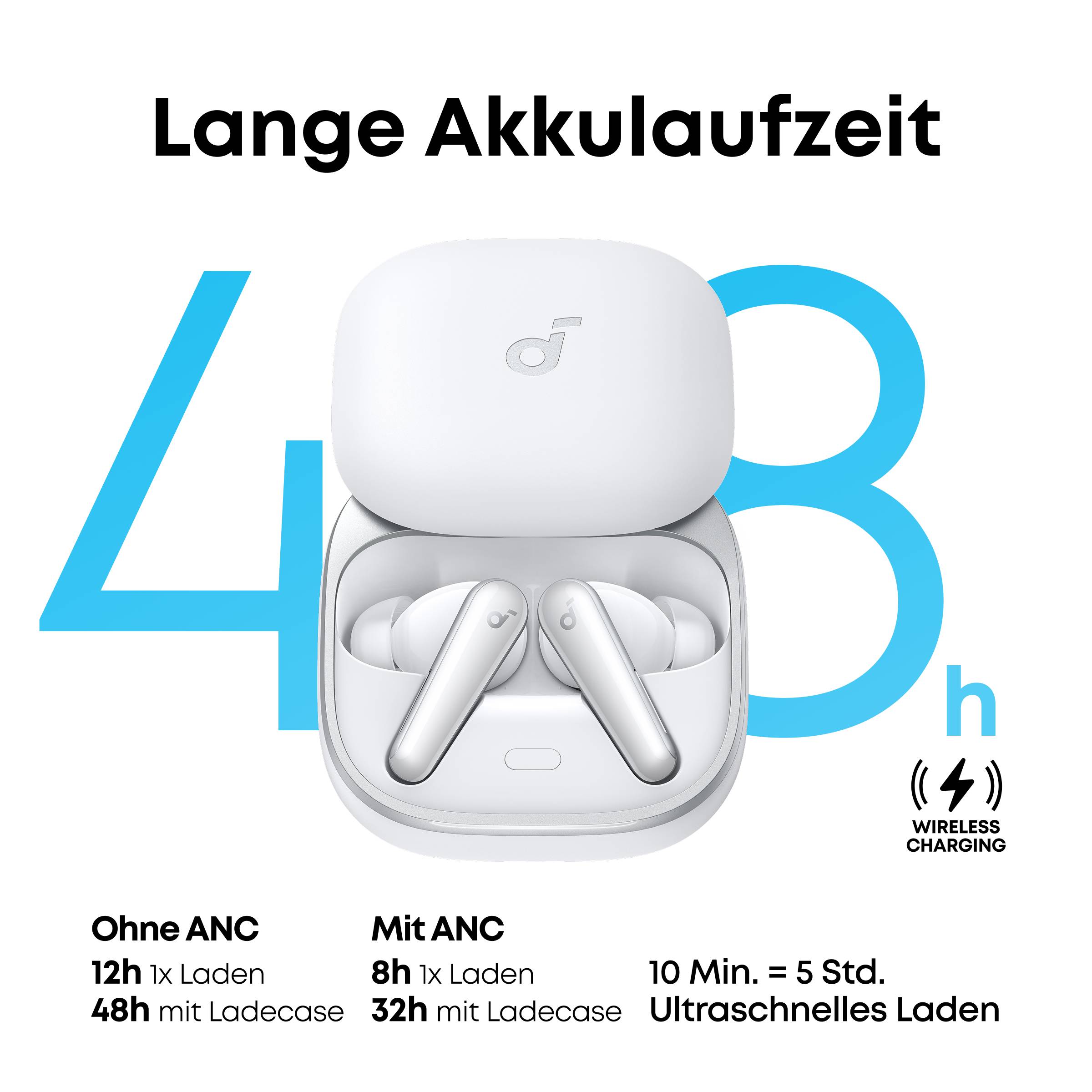 Im Normal-Modus bieten die Earbuds mit 1x Laden bis zu 12h, mit dem Case bis zu 48h Spielzeit. Mit ANC sind es 8h und 32h mit Case. 10 Min. Schnellladen = 5h.
