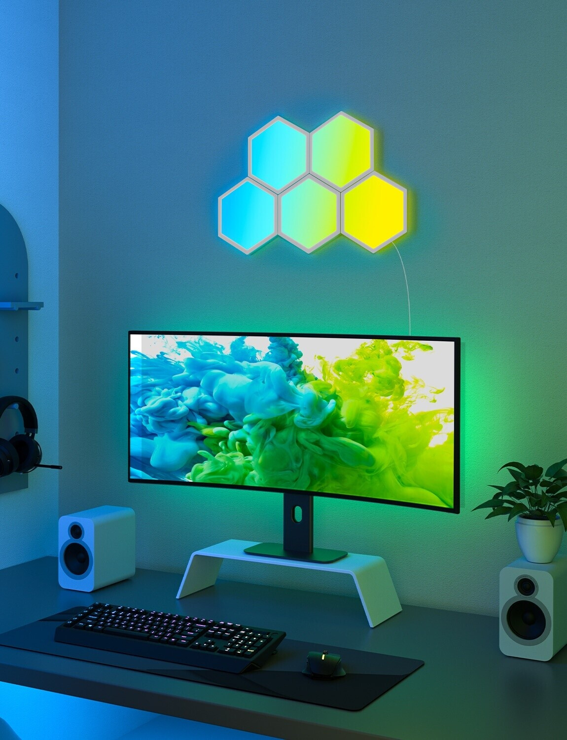 Die Govee Glide Hexa Light Panels bestehen aus 7/10 Paneelen, die in verschiedenen Formen zusammengestellt werden können. Sie können über Ihre bevorzugten Sprachassistenten wie Alexa und Google Assistant sowie über die Govee Home App gesteuert werden. Sie können sogar Ihr Design, Effekte, Farben und mehr anpassen.