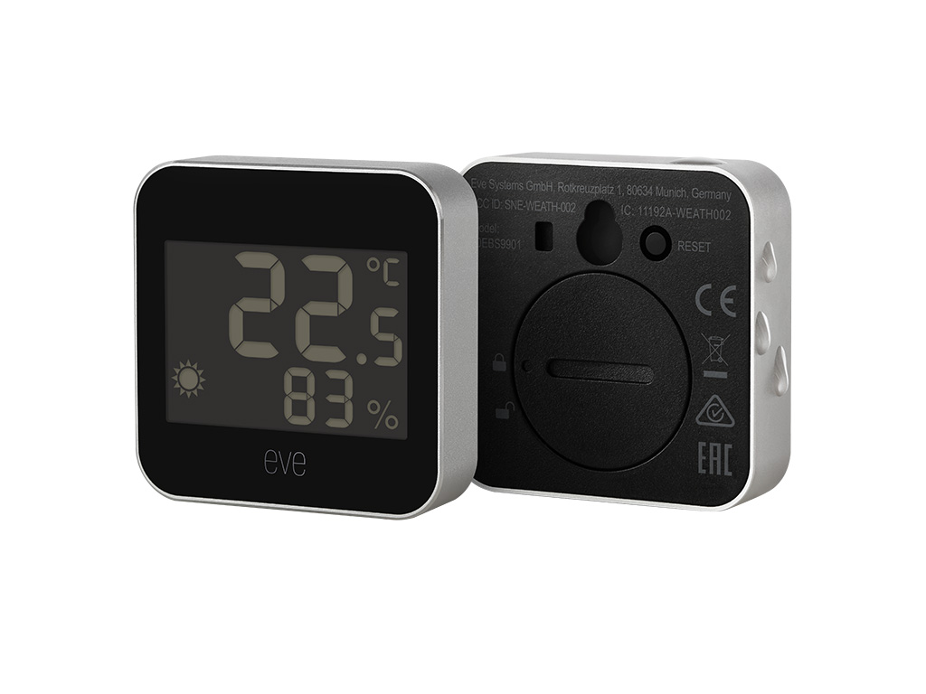 - Voraussetzungen: Erfordert ein iPhone oder iPad mit der neuesten Version von iOS/iPadOS und einen Apple TV 4K (2. Gen. / 3. Gen. 128 GB), HomePod (2. Gen.) oder HomePod mini als Steuerzentrale. Das Verbinden von Eve Weather mit einer zusätzlichen Plattform erfordert eine Steuerzentrale dieser Plattform (siehe evehome.com/hub)