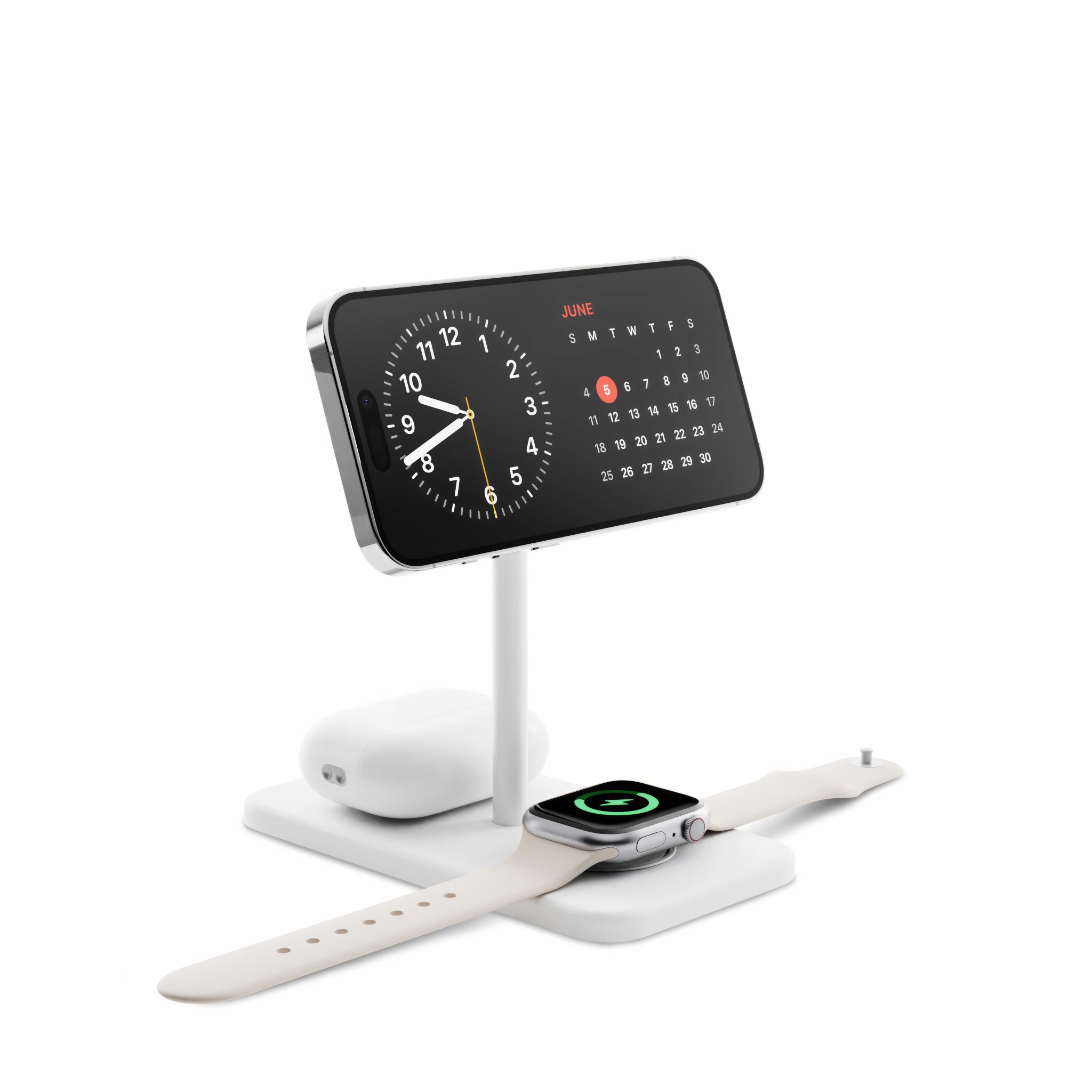 HiRise 3 Deluxe ist ein luxuriöses, platzsparendes kabelloses 3-in-1-Ladegerät für Ihre drei wichtigsten Geräte. Legen Sie Ihr iPhone auf das vertikale Ladegerät, um Benachrichtigungen auf einen Blick zu sehen. Klappen Sie das Schnellladegerät für die Apple Watch auf, um sie im Nachttischmodus aufzuladen. Und laden Sie die AirPods oder sogar ein zweites Telefon auf der dritten Ladestation.