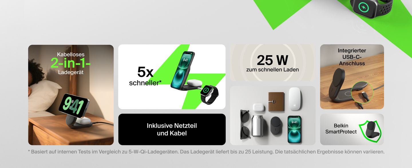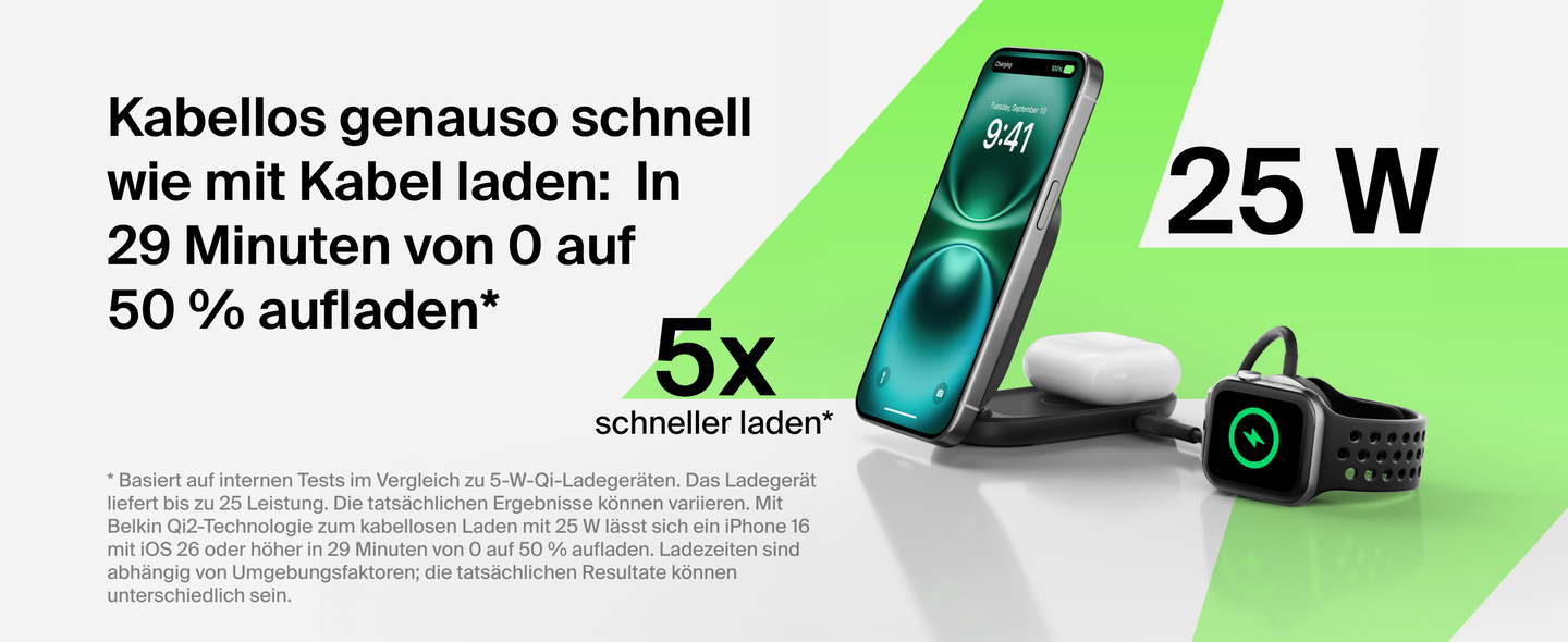 - 5x schnelleres kabelloses Laden mit bis zu 25 W