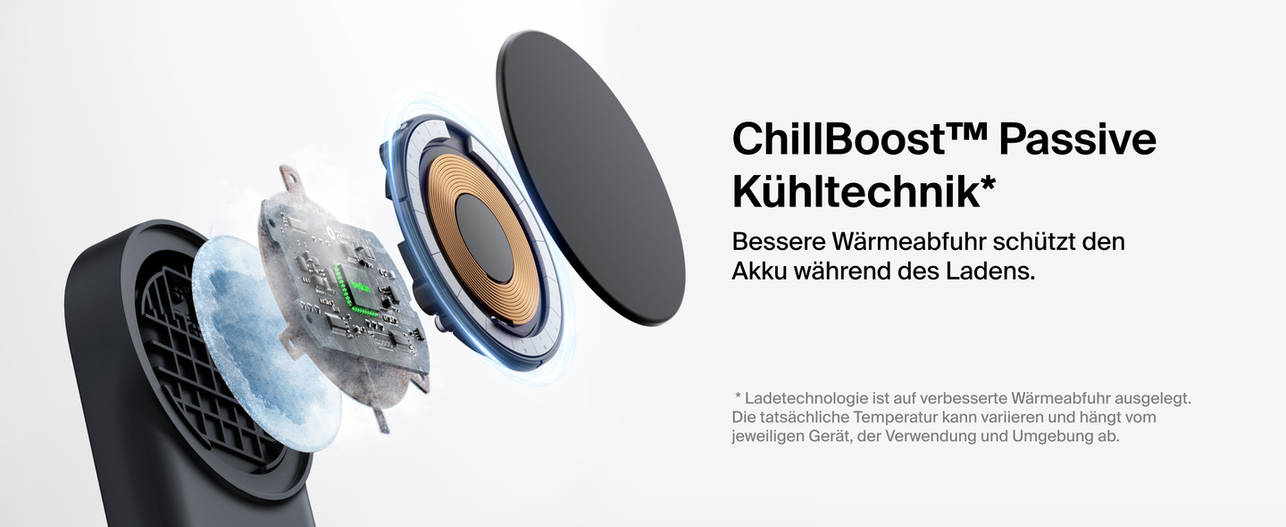 - ChillBoost™ passive Kühltechnik wurde entwickelt, um Erwärmung während des Schnellladens zu reduzieren und den Akku zu schonen