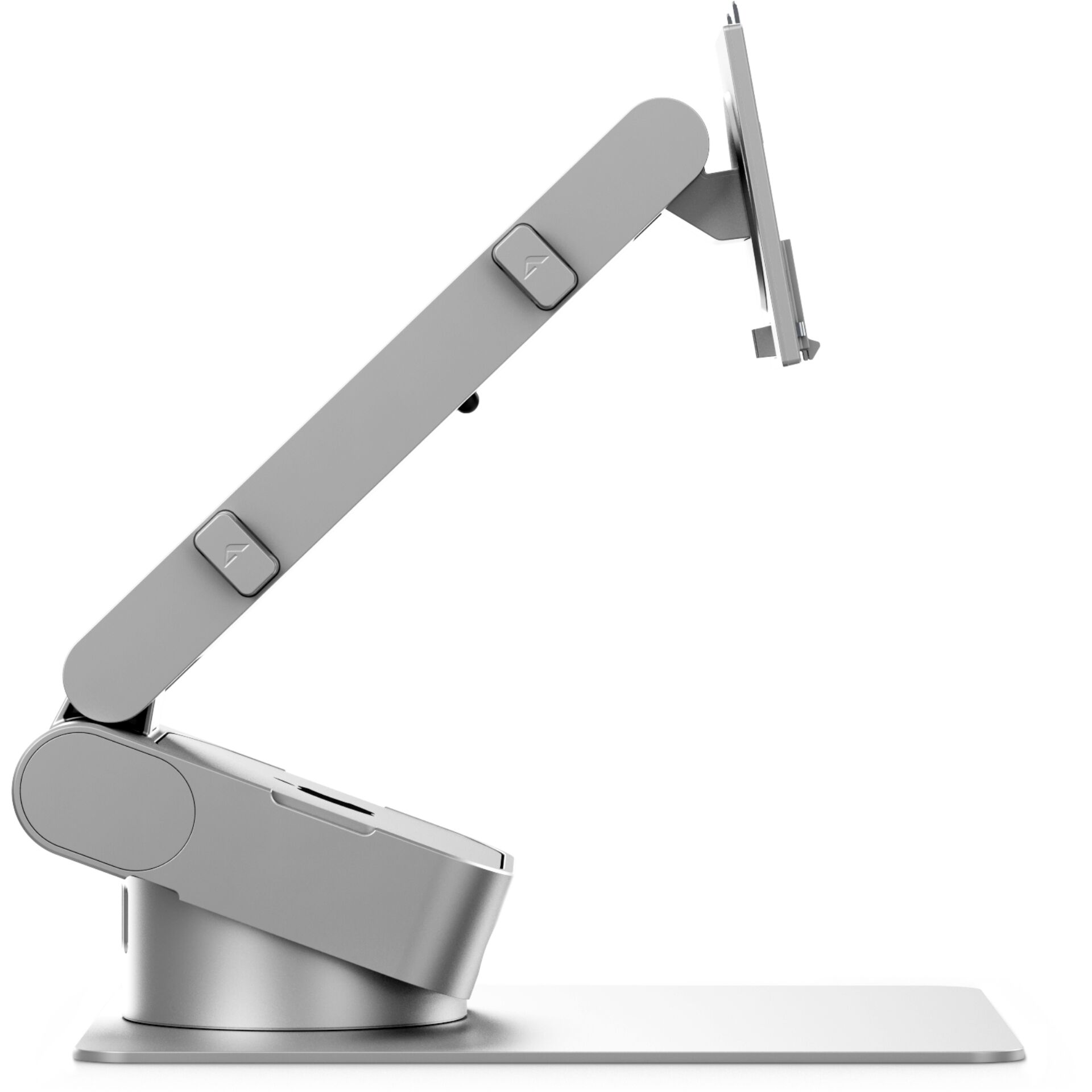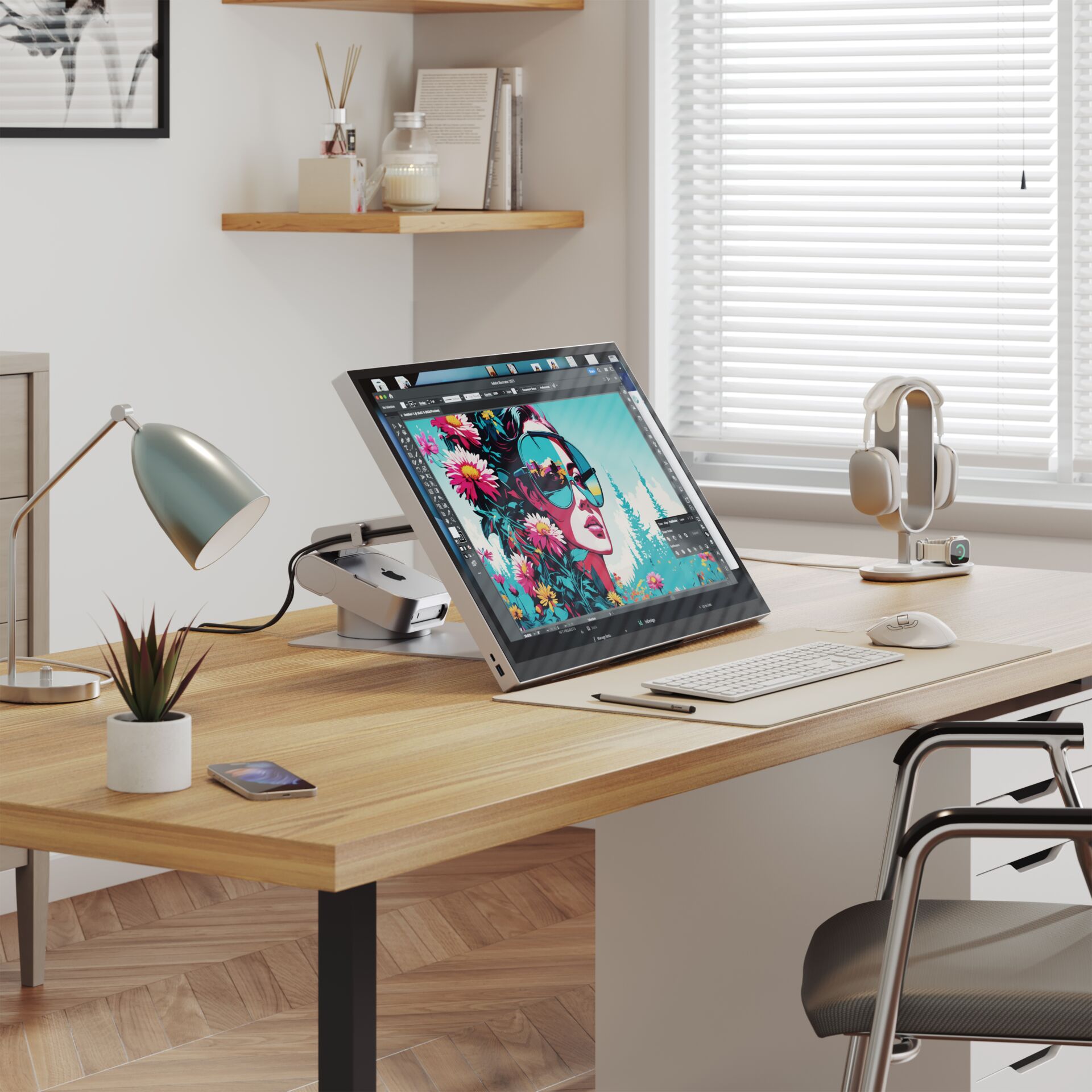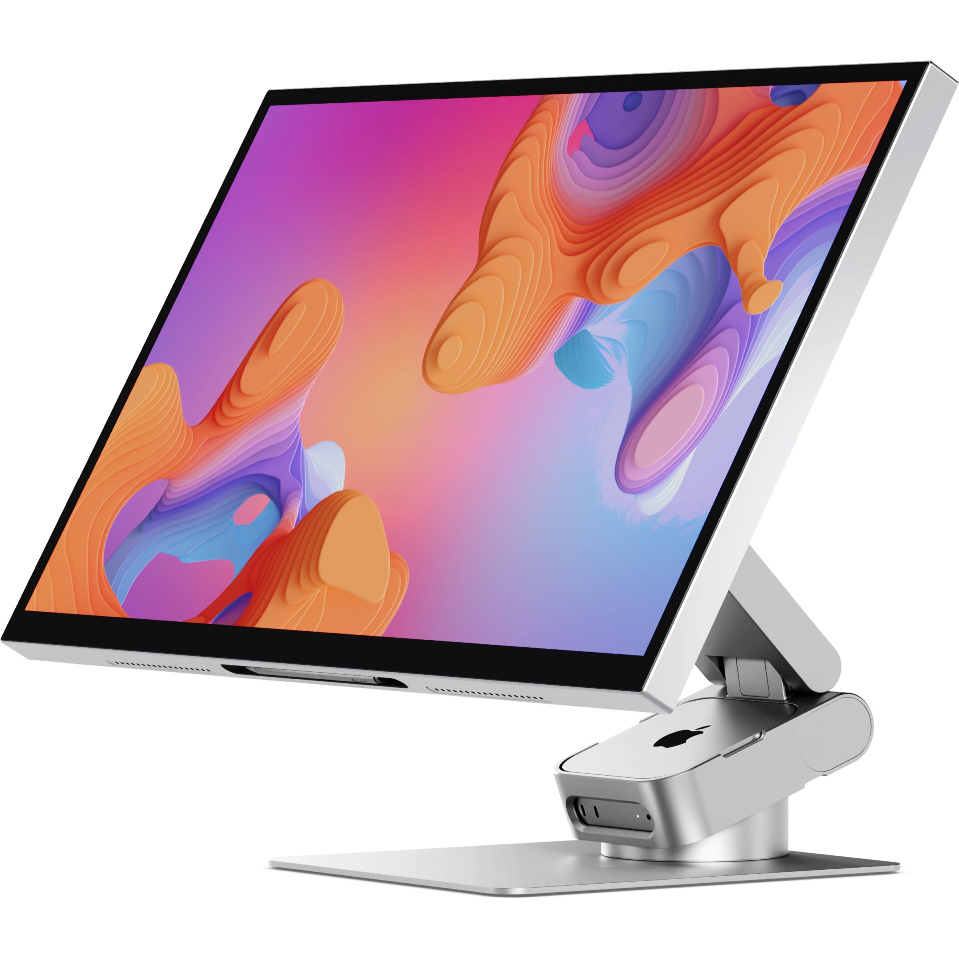 Der bewegliche Monitorstand unterstützt flach geneigte Arbeitspositionen für Touch- und Zeichenanwendungen und ist Teil des ASPEKT-Ergonomiekonzepts. Die Befestigung des Monitors erfolgt über eine Quick-Release-VESA-Aufnahme, während der Mac mini in der integrierten Halterung innerhalb der Standkonstruktion fixiert wird. Eine magnetische Kabelführung unterstützt eine strukturierte Kabelverlegung am Arbeitsplatz.